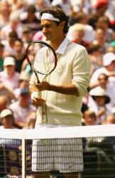 Roger Federer opted for a staid look but keeping with the Londonesque theme, he donned a cardigan, also by Nike, with the stylized initials RF emblazoned on the front.